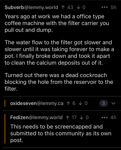 I lived with a buddy of mine who owned one of the first generation Keurig machines. We had problems with roaches cropping up here and there and we tried everything to get rid of them from diatomaceous earth to calling an exterminator but they always came back and we had no idea where they were coming from. We had assumed at some point that it was probably from an adjacent town home so we just dealt with them as they came and I didn’t think much of them after that. Fast forward a year or so and I’ve moved out of the place. I get talking with my buddy about the old roach problem and he tells me that he found out where they were nesting when his Keurig machine stopped working and he attempted to open it up and they came pouring out of the machine. My buddy grabbed some roach spray we had stocked up on and drenched the machine in it to kill as many of the damn things as he could. He ended up throwing that machine away. I’m glad I switched to French press and moka pots forever ago.