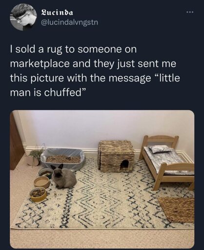 It’s mostly delighted or pleased, although it can occasionally mean the opposite, especially in the military. I believe it started off as “proud.” This bunny is delighted and proud of his new rug.
