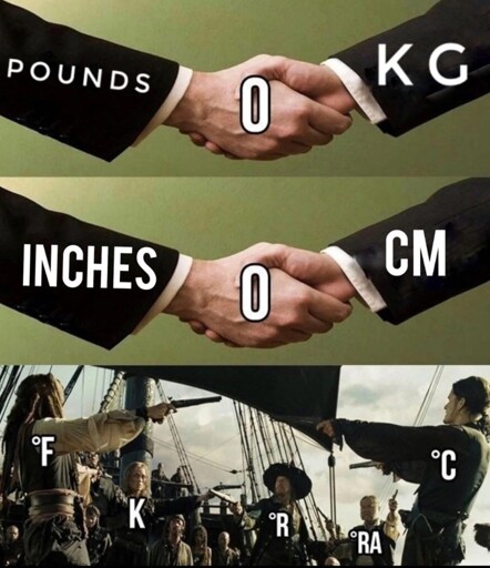In the original farenheit definition my 0 farenheit was not your 0 farenheit heheOnly Kelvin is valid thermodynamically because thermodynamics often needs absolute temperature for the math to work out right. Rankine is only for masochistic idiots who like fucking up their math and having extra stupid constants all over the place to compensate for their shitty unit system.
