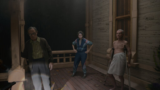 Today’s game is Alan Wake II. Did you know these guys were on the front porch? Because I didn’t. 4 playthroughs in and I had no idea these guys were here until I went back in the house and saw one of them walking out front. I thought I was seeing things at first or it was some sort of Easter egg, but I found them out here and they were just chilling (or in the guy in the towel’s case, he was literally chilling)