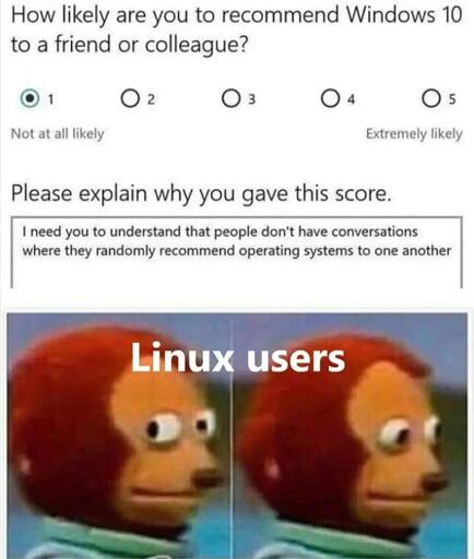 I remember seeing this meme a few years ago before I started using linux, and I showed this to a buddy and we were like “yeah lmao who the fuck goes around recommending OSs to people?”.
