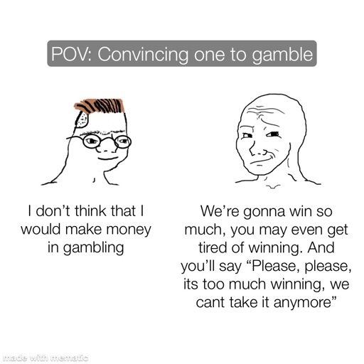 You know what the most fucked up thing about gambling? When you are with your friends (or family or people you know) and a crazy topic comes on and you say something absurd like: “Oh. I bel 1 billion dollar that the gov does have our interests in mind” And then comes up that obnoxious acquaintance that nobody likes, only to say: “Ohh…you bet? I take that bet?” Fucking gamble adictics