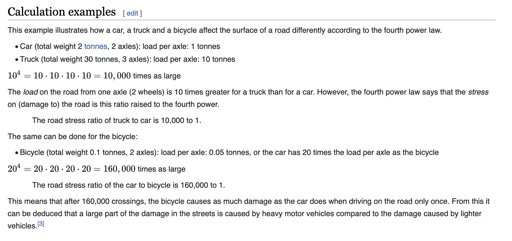 I’m sure somebody has done far more detailed modeling, but that’d entail consideration not only of weight distribution, but the properties of different road surfaces and their relative frequencies of occurrence relative to road usage patterns. Modeling all that can get messy fast. Hence the populatiry of the fourth-power rule of thumb, which isn’t a bad gross approximation.