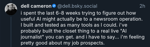 Given that LLMs are always at least several months behind reality in their training, and the data they’re training on is content produced by real journalists, I really don’t see how it could EVER act as a journalist. I’m not sure it could even interview someone reliably.