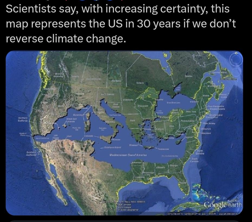 Oh, this again? Come on. That’s not what scientists say. It’s a map of the Mediterranean Sea superimposed on the US. It’s a joke. Florida is going to be submerged way before the Rocky Mountains.