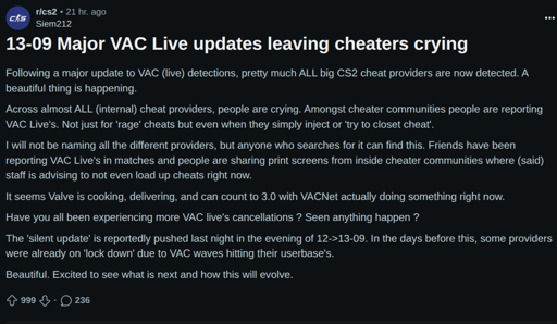 I really hope valve can get VAC into a good space so it can be an example of doing anti-cheat well without having to be a rootkit. Looks like we’re heading towards that point. Hopefully this change will last
