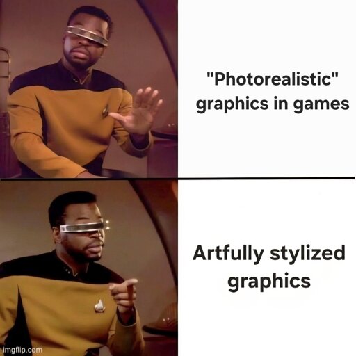 OK we’re definitely talking about different things when we say photorealism. I see stylized and photorealistic almost as on a linear spectrum. I realise there are more dimensionz to it than that, but that’s the usage I think the meme is critiquing. That’s how I took it, anyway.