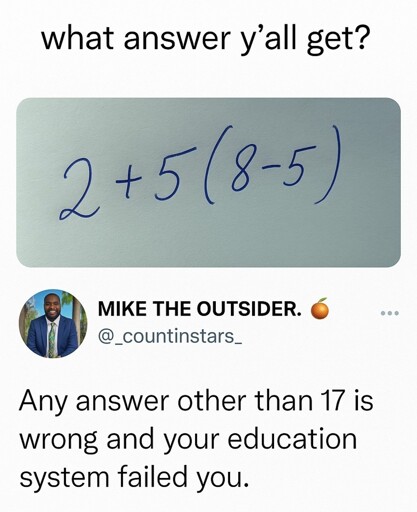 minus-squarebuddascrayon@lemmy.worldlinkfedilinkEnglisharrow-up13·edit-24 days agoParentheses first then Division or Multiplication then add or subtract. PEDMAS 8-5= 3 3*5=15 15+2=17