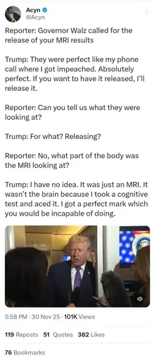 Trump managed to convince me in two sentences that his MRI was on his brain. He really does have a way with words.