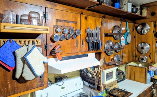 Dry goods storage above the cabinets got installed first, a double magnetics knife strip so knives didn’t go flying when you open the cabinet. Dry measuring cups, liquid measuring cups, pot lids for two sets of pots, small pastry rolling pin, instant read thermometer, pot holders, two skillets (one not seen to the left, a special shelf on the inside of a cabinet just got my instant coffee, and so much more like quick grab spice/oil racks over the sink.