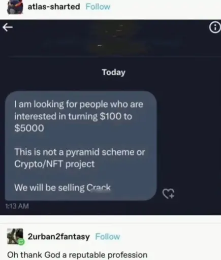 minus-squareYellowParenti@lemmy.wtflinkfedilinkEnglisharrow-up13·24 days ago Buy as much coçaine as you can Stir up with baking soda Put in the oven @450 for 30 minutes Taste for donéness (add sugar if you like) Sell whatever is left from you 3 day crack binge with a healthy profit margin ??? ⁷. Repeat