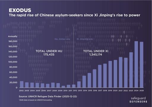 Tentative data for the year 2025 from the UN’s High Commissioner for Refugees (UNHCR) shows the mass exodus of asylum seekers from China continues unabated and is set to either rival last year’s record-breaking number or possibly exceed it. The tentative data, to be adjusted and finalized later in 2026, estimates some 178,725 asylum seekers from China. This is a far cry from the numbers seen during Hu Jintao’s reign, when it would stay between 7,000 and 21,000 annually.