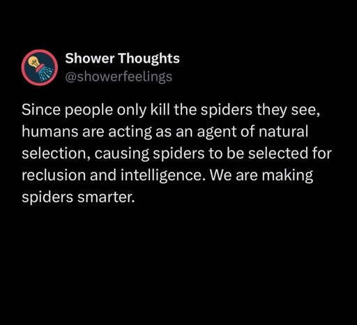 Also, any effects we may have on arthropod selective evolution by randomly killing visible spiders is going to be vastly overshadowed by the very rapid and immediate changes we’re making to the environment broadly.