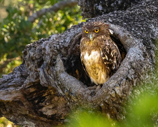 Tucked into a tree hollow, this brown fish owl keeps a quiet watch.