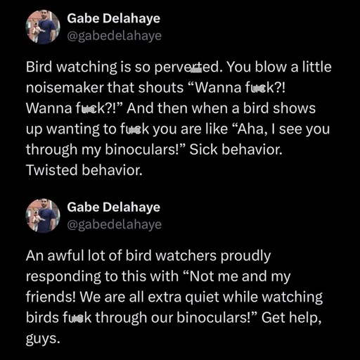 minus-squareTheTechnician27@lemmy.worldlinkfedilinkEnglisharrow-up71·edit-225 days ago Pictured: sanitizing the words “fuck” and “perverted” out of a joke about voyeuristically getting off on watching real, actual birds having sex.