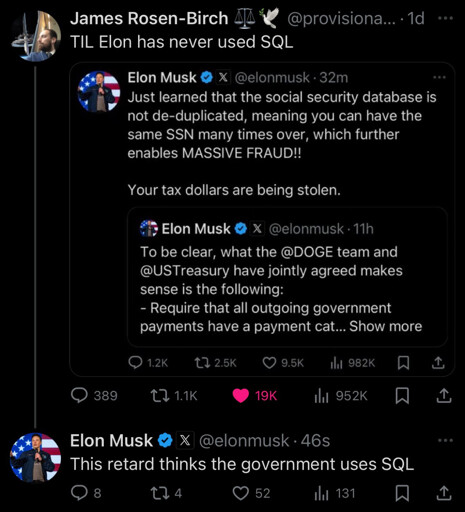 According to many comments, the US government DOES use SQL, and Musk is not understanding much what’s going on.