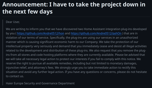As Rossmann said, don’t ever buy anything from such a shitty company that doesn’t respect their customers. This move by Haier is nothing other than a slap in the face for everyone, who just wants to comfortably control the product they paid for. This company is actively hostile towards their paying customers. Fuck these bastards!