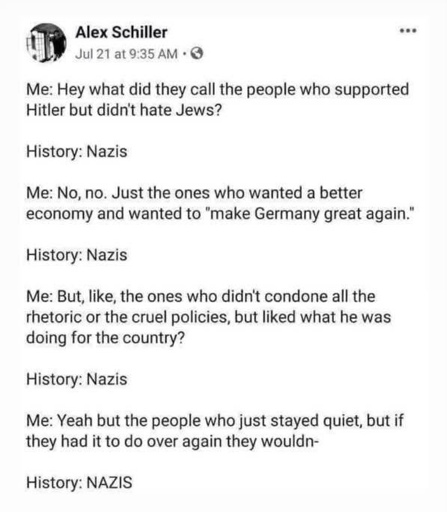 This meme ignores a ton of nuance, as there are many who publicly appeared to support the Nazis but worked behind the scenes to stop Hitler or save people’s lives.